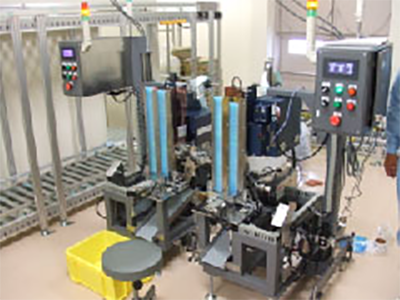 開発したのは、前面、側面、後面の3面貼りが同時にできる自動化装置でした。これにより、ラベル貼付け時間は1個3秒弱に短縮。大幅な省時間につながり、圧倒的な差で他メーカーを引き離して国内シェアトップになられました。手貼りではゆがみが出るケースもありましたが、機械では正確な仕上がりのため受注量も増えて、結果的には新たなパート社員さんを雇い入れられたということです。