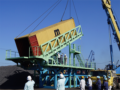 答えはダンプアップ方式にありました。トレーラーで貨物船まで運んだコンテナの片方をクレーンで吊り上げて、中身だけを船艙に直接落とし入れて火力発電所まで運ぶという方式です。従来より貨物船での輸送はありましたが、2台のクレーンを使ってコンテナごと吊り上げて貨物船に積み込むのが通常でした。この場合は高度なオペレート技術を要しましたが、開発したコンテナダンプはクレーン1台なので操作性もよく、作業員は12人から5人に。作業効率が大幅に向上し、結果的に安定した電力エネルギーの供給に貢献できました。